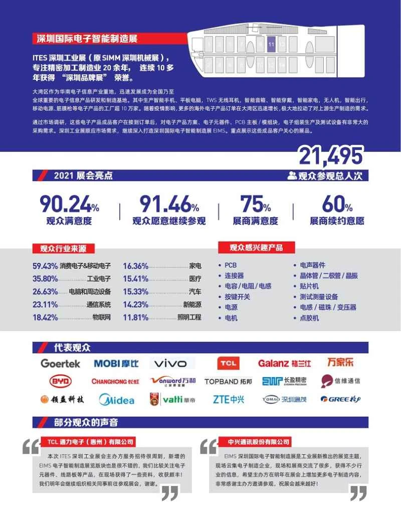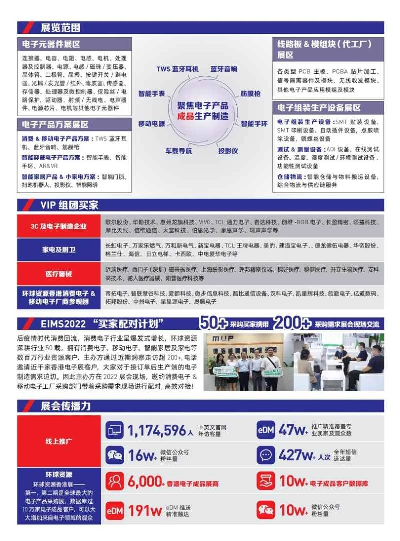 The Shenzhen International Electronic Intelligent Manufacturing Exhibition ( EIMS ) and the ITES Shenzhen Industrial Exhibition complement each other, bringing together upstream and downstream enterprises in the electronic intelligent manufacturing industry chain to present a grand feast of the entire industrial manufacturing industry chain for South China. EIMS is also in line with the world's largest electronics sourcing exhibition, "Hong Kong Global Sources Electronics Fair," promoting each other and building a bridge between Chinese and foreign electronic component trade.